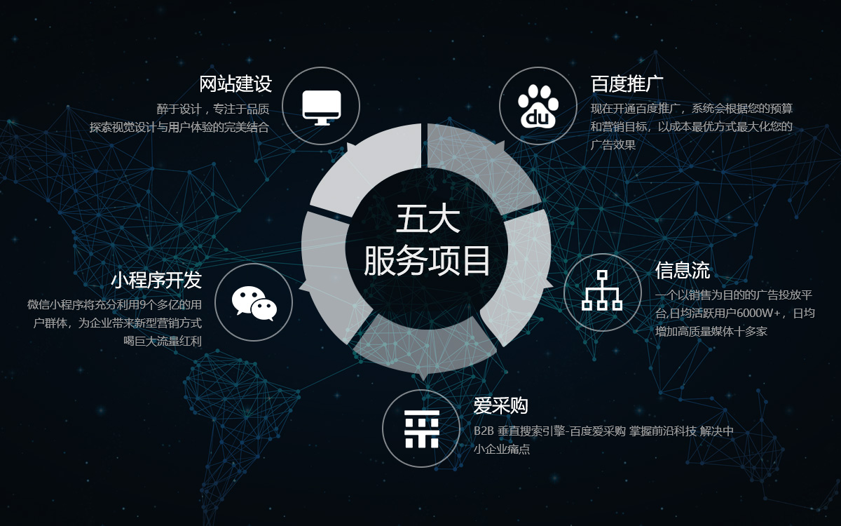 集團以為企業提供最完善、最有效的網絡營銷策劃方案為使命,目前擁有九家全資分公司,囊括電子、機械等在內的 37個一級行業和201個二級行業。業務覆蓋青島、濟南、煙臺、濰坊、威海、日照、臨沂等山東半島,經營業務主要有搜索推廣、直通車、糯米、信息流、全景地圖、金融、滴滴打車、網絡增值、瑞思英語九大模塊,是搜索、糯米、金融、滴滴打車等互聯網企業在山東半島的獨家運營商與合作伙伴。